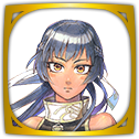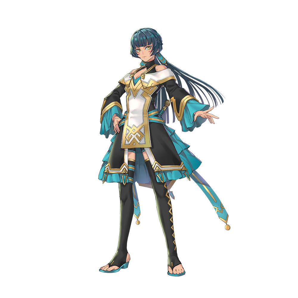 Athena, eine Schwertkämpferin aus Marths Armee, tritt in emblanischer Kleidung auf! Dieser stilvolle Look zeigt das klassische Schwarz und Gold Emblas in Kombination mit bläulichen Akzenten. Und die lange Schleife um ihre Taille ist ein tolles Accessoire!